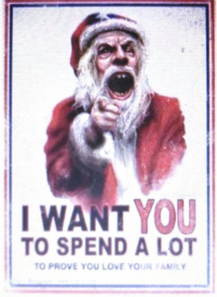 An example of culture jamming in Abusters is this christmas image. This image is direct address as the ‘santa’ is pointing towards the audience and the words ‘you’ are in captital letters and red font showing the importance of the word.The image is attacking capitalism in the Christmas persiod as it is the best time of year for compainies and the economy to make more many. The image is a binary opposite as adverts or images in magazines would portray Santa Claus as happy and jolly however Adbusters has portrayed him as slightly disheveled and creepy to possibly represent him as the captalist society which we live in. The image further hsows the capatilist society as the full text reads “I want you to spend a lot to prove you love your family” creating the viewer into feeling guilty as they might of not bought their family enought presents therefore making them go out and buy more, leading into a constant cycle of falling for these captalist/consumerism ideologies and the idea that the more you have the more love you will recieve when that isn’t the case it’s about quality not quantaiy. By showing a poster like this it helps readers to be aware of these capatlists/consumerism schemes and to try and have direct approach to stop them and the idea that you need more buy more to be happy/loved, furthermore as Adbusters is a left wing magazine they want to try and abolish inequalities within society for example this culture jam is guilt tripping viewers into buying more to earn love from their family members but some people may not be able to afford presents due to not having a lot of money therfore implying that they won’t be loved by their family therefore relating to left wing ideologies as there are inequalities within money/ finacial aid and Adbusters wants their audience to be aware of these situations and tackle the ideas and image of capitalism and what it has done to our view of the world.