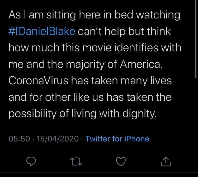 I also think the film is for a political minded audience as the film challenges the governments placement in current situations, the film is more to the left wing due to Loach being part of the labour party; the film also has ideologies of socialism and peoples well-being and Loach has also been invloved with Jeremy Corbyn’s campaigns, however they film make have convey some right wing ideologies as Loach wasn’t always a left wing supporter. In he younger year, at school he represented the Tories in a mock election and his farther was a working class Tory therefore even though he is now a left wing supporter there will still be some right wing perspective.
